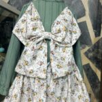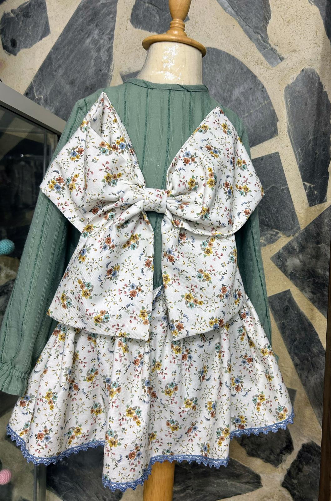 La falda de estampado floral, con colores cálidos y delicados, aporta movimiento y frescura, rematada con un fino encaje azul que añade un toque romántico. La prenda se completa con un espectacular lazo a juego, grande y vistoso, que convierte este conjunto en una auténtica pieza protagonista para cualquier ocasión especial.