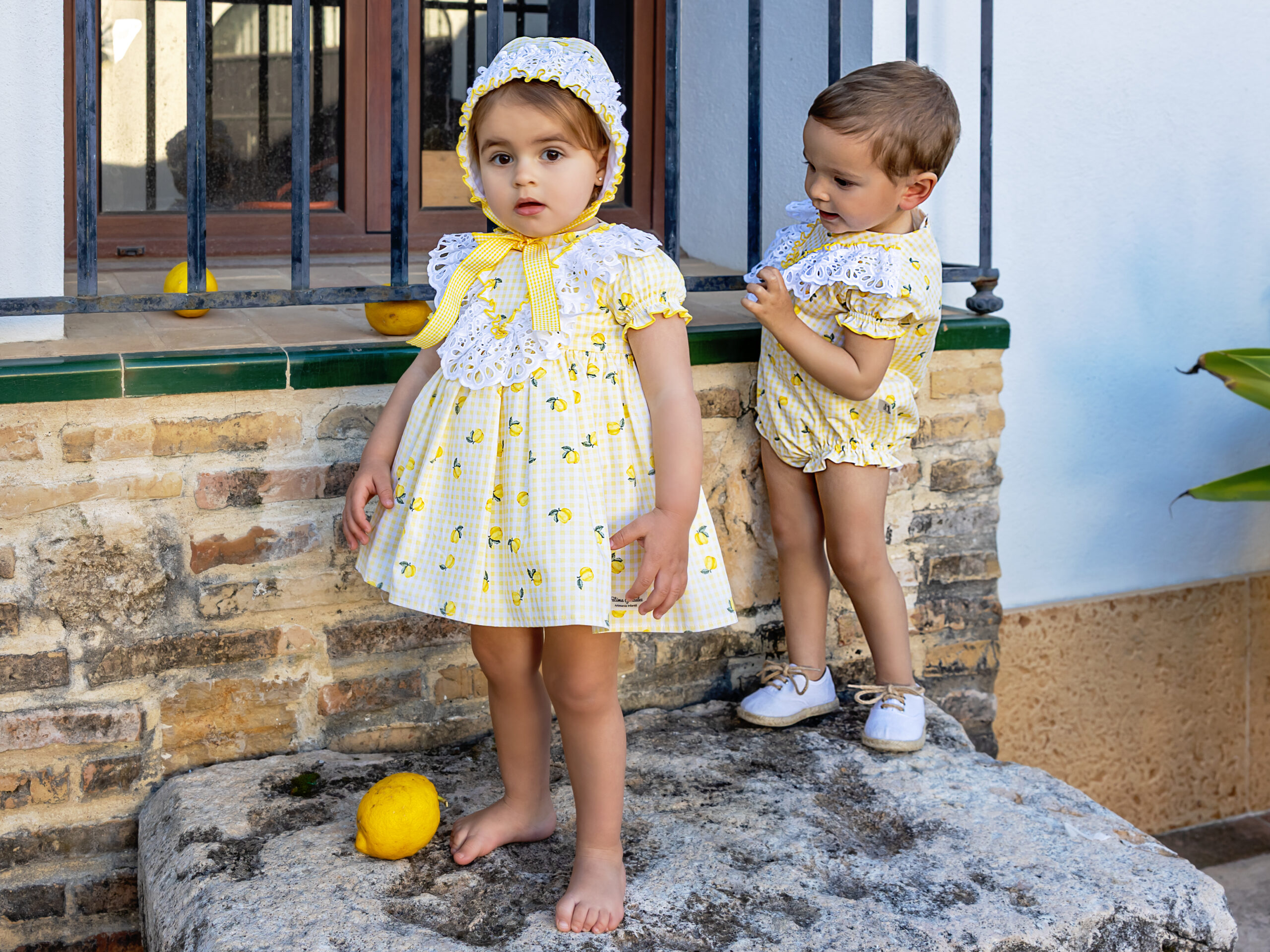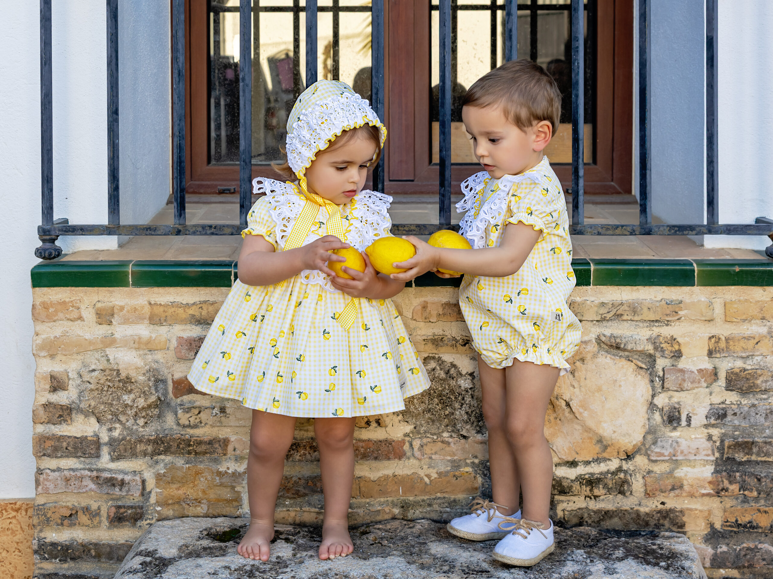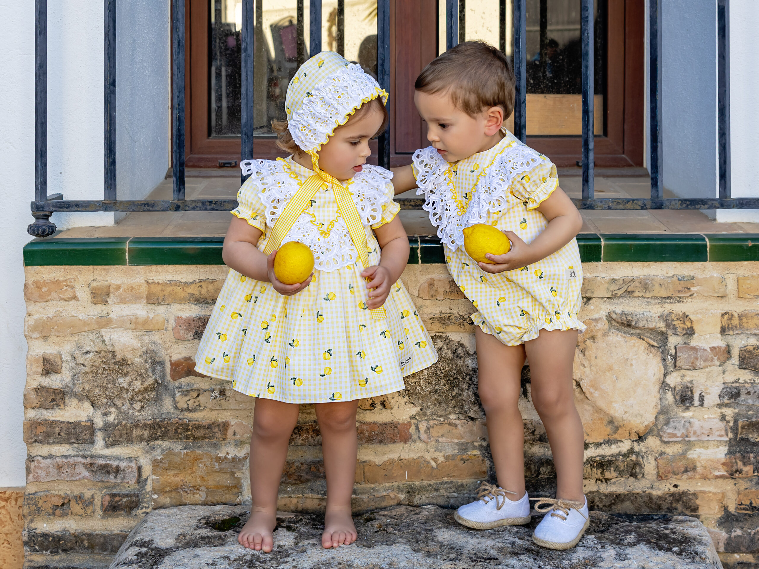 El Jesusito límenselo es una prenda dulce y luminosa, perfecta para los días de verano y ocasiones especiales. Está confeccionado en un tejido ligero de cuadros en blanco y amarillo, decorado con un encantador estampado de pequeños limones que aporta frescura y un aire muy mediterráneo.