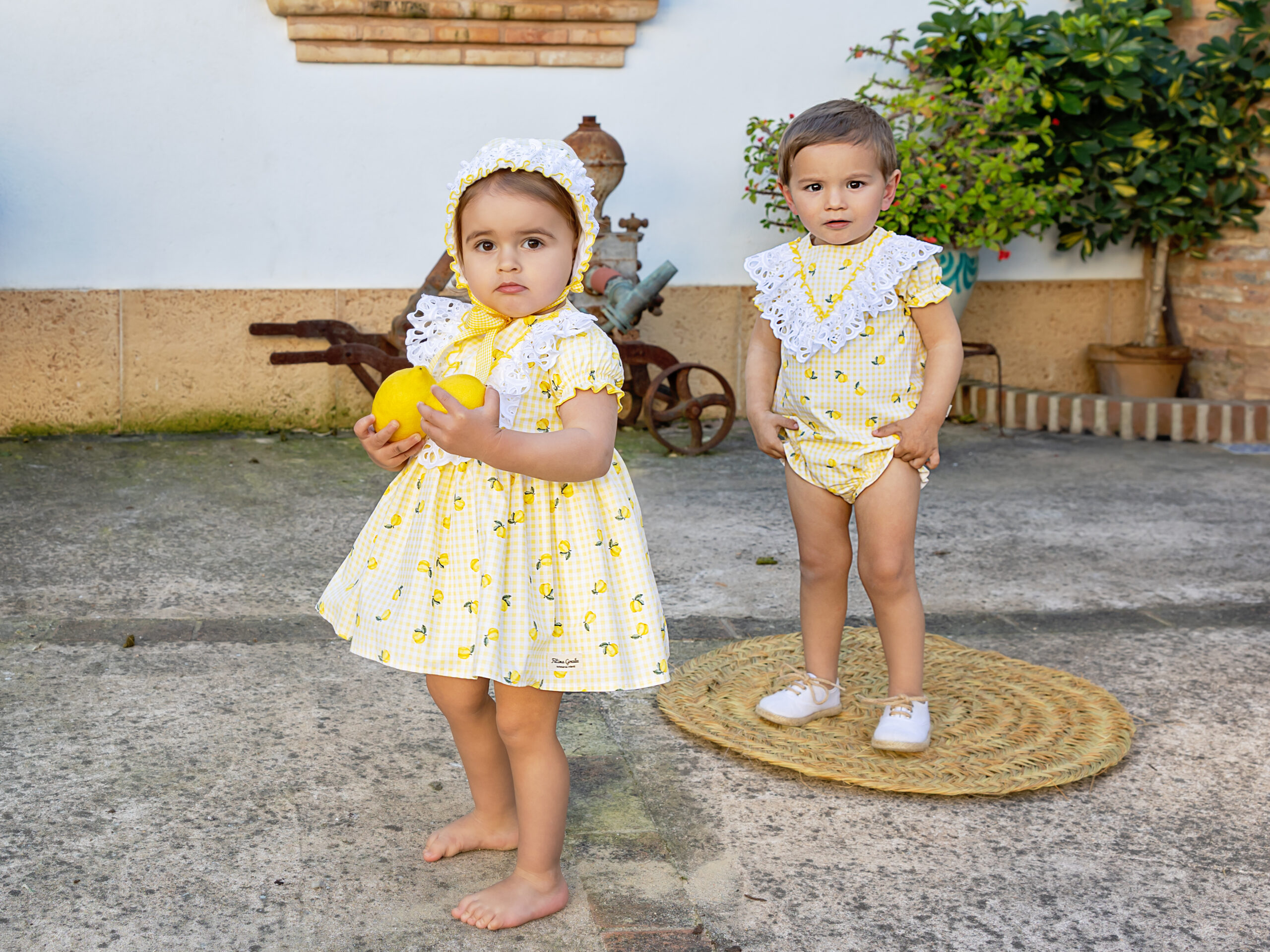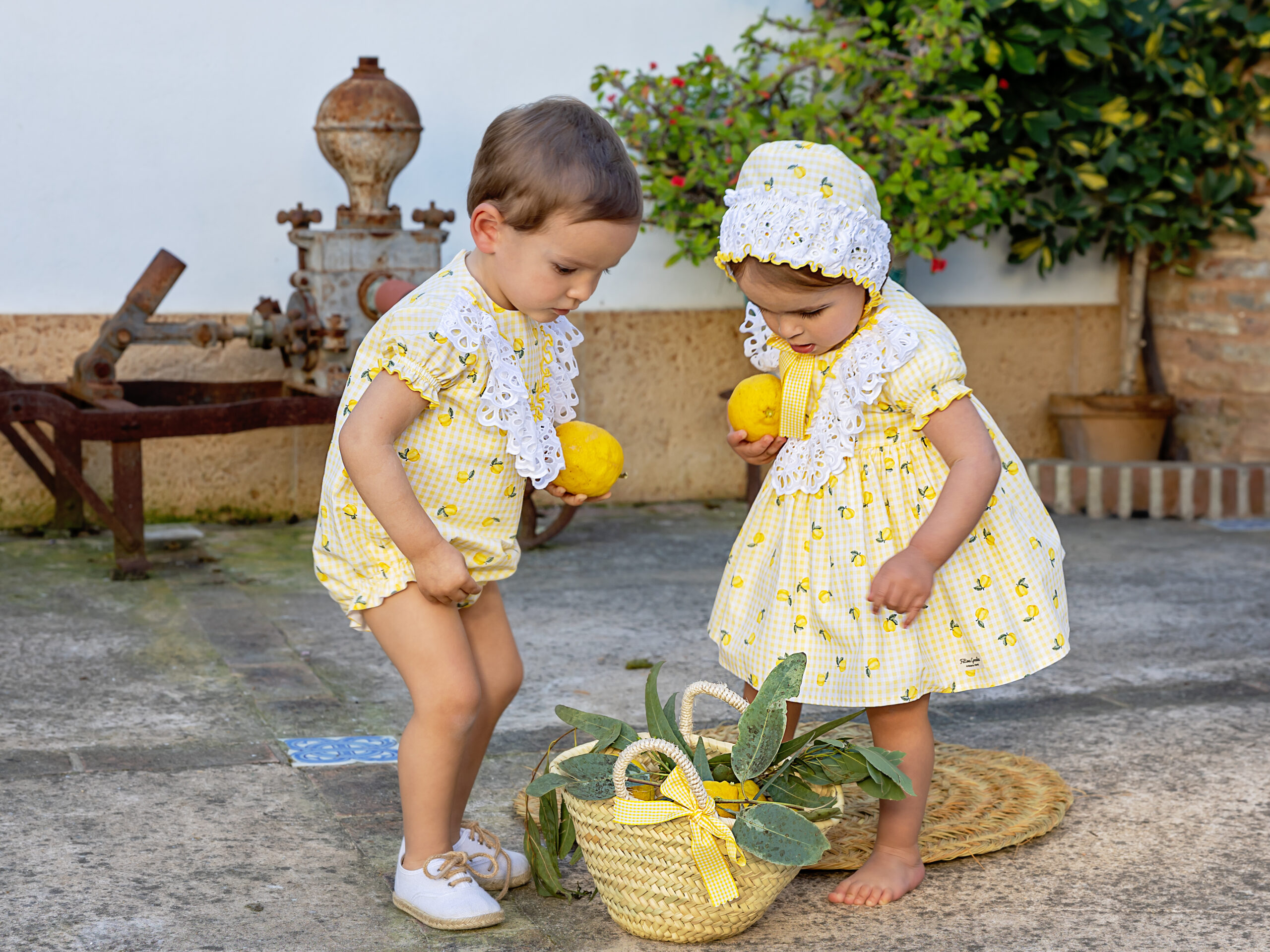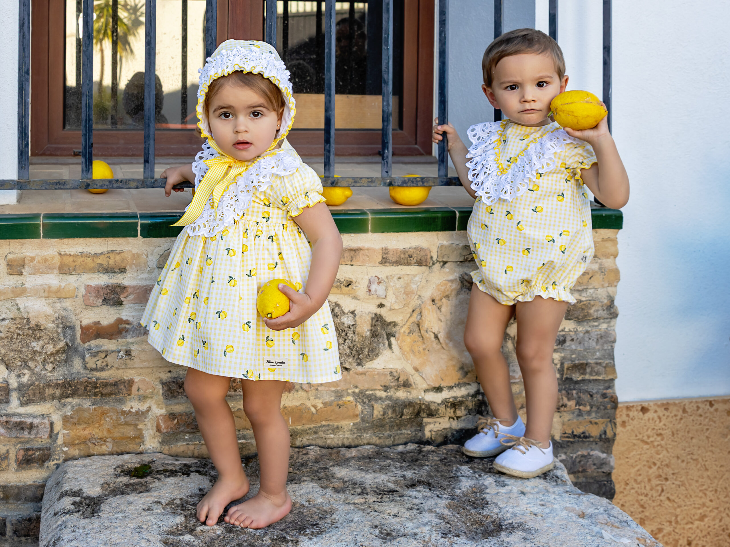 El Jesusito límenselo es una prenda dulce y luminosa, perfecta para los días de verano y ocasiones especiales. Está confeccionado en un tejido ligero de cuadros en blanco y amarillo, decorado con un encantador estampado de pequeños limones que aporta frescura y un aire muy mediterráneo.