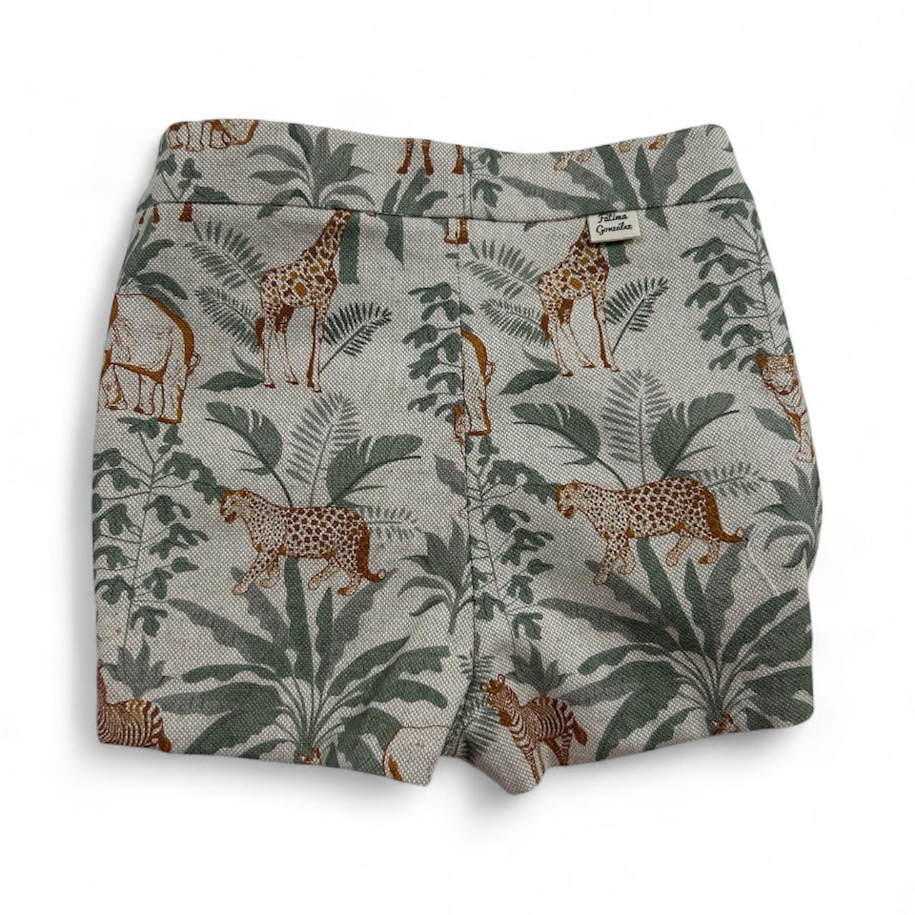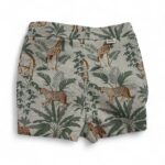 Una prenda que captura la esencia de la naturaleza indómita y mágica. Este pantalón unisex con elástico en la cinturilla está confeccionado en un tejido resistente con un estampado de inspiración selvática: jirafas, leopardos y cebras se camuflan entre palmas y helechos en tonos tierra , verdes liquen, verde seco y oxido.