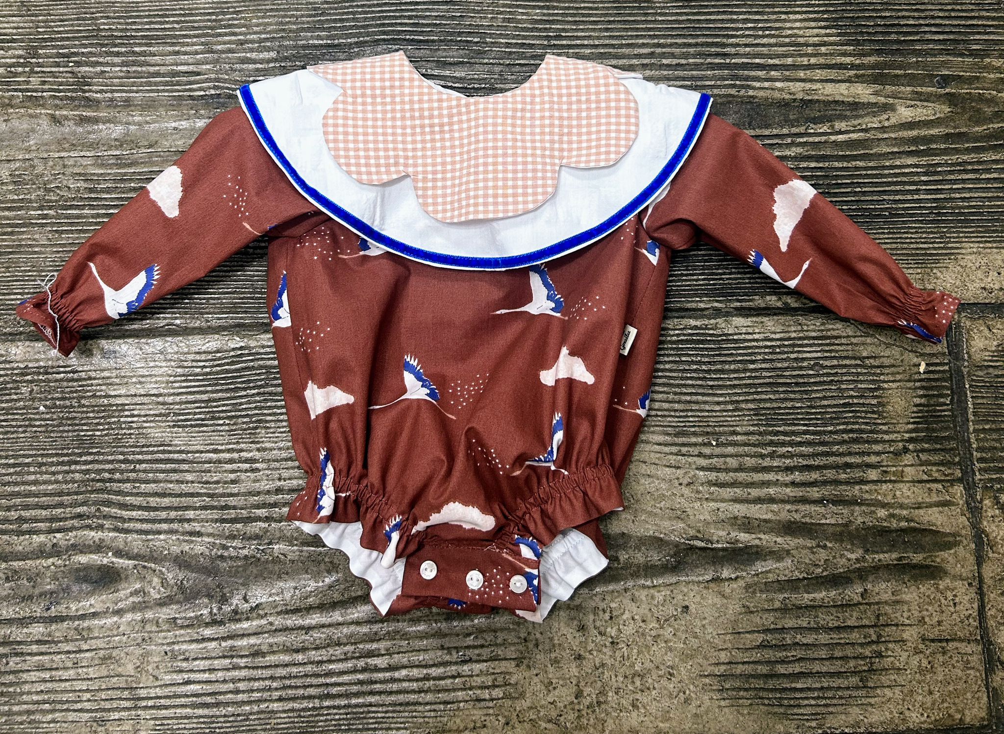 Este adorable pelele para bebé está confeccionado en un suave tejido estampado con elegantes cigüeñas en tonos azul y blanco sobre un fondo terracota, creando un diseño único y encantador. Su cuello babero de doble capa destaca con un delicado vichy rosa y una base blanca con vivo azul intenso, aportando un toque clásico y muy especial.