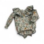 Una prenda que captura la esencia de la naturaleza indómita y mágica. Este Pelele unisex está confeccionado en un tejido resistente con un estampado de inspiración selvática: jirafas, leopardos y cebras se camuflan entre palmas y helechos en tonos tierra , verdes liquen, verde seco y oxido.