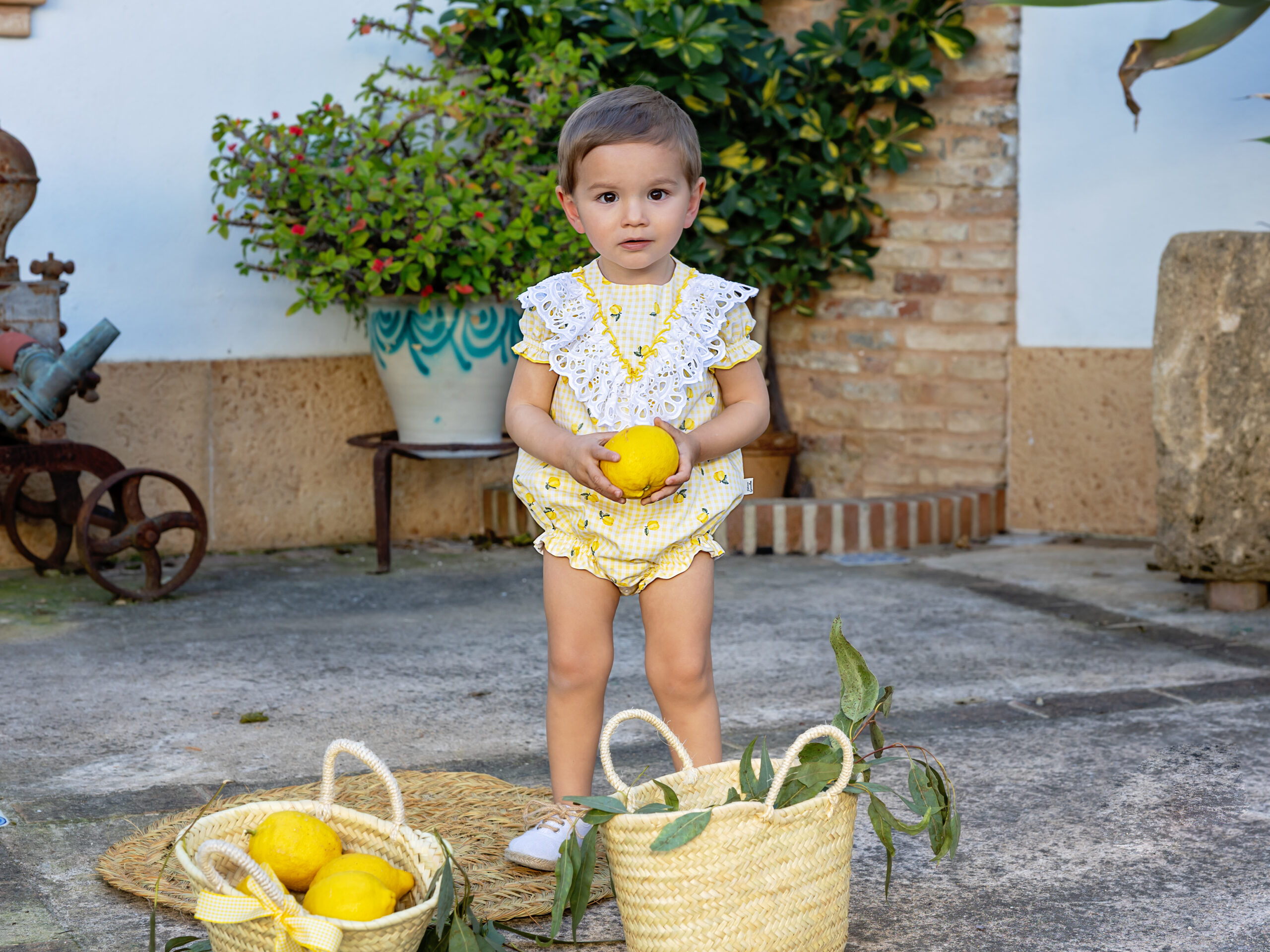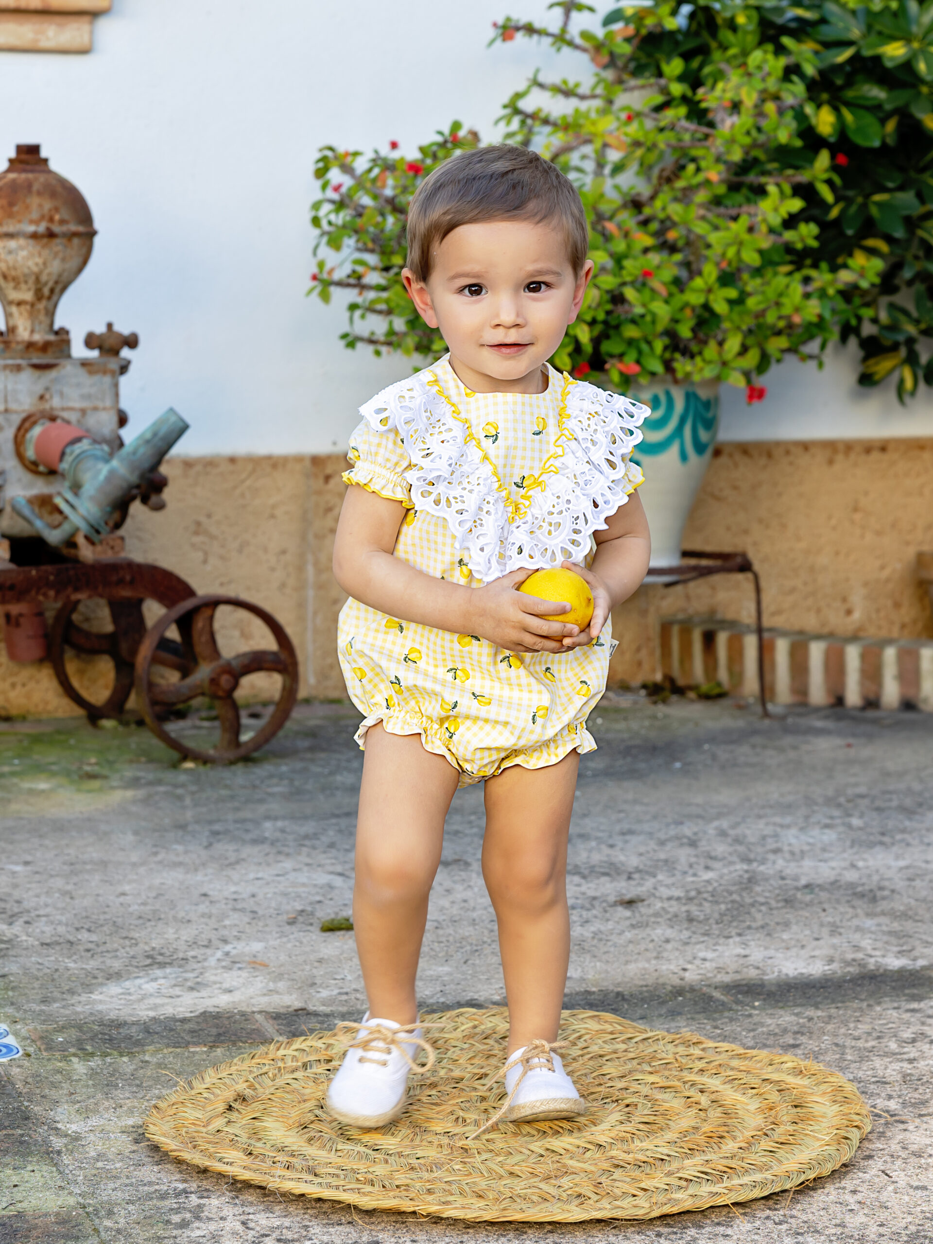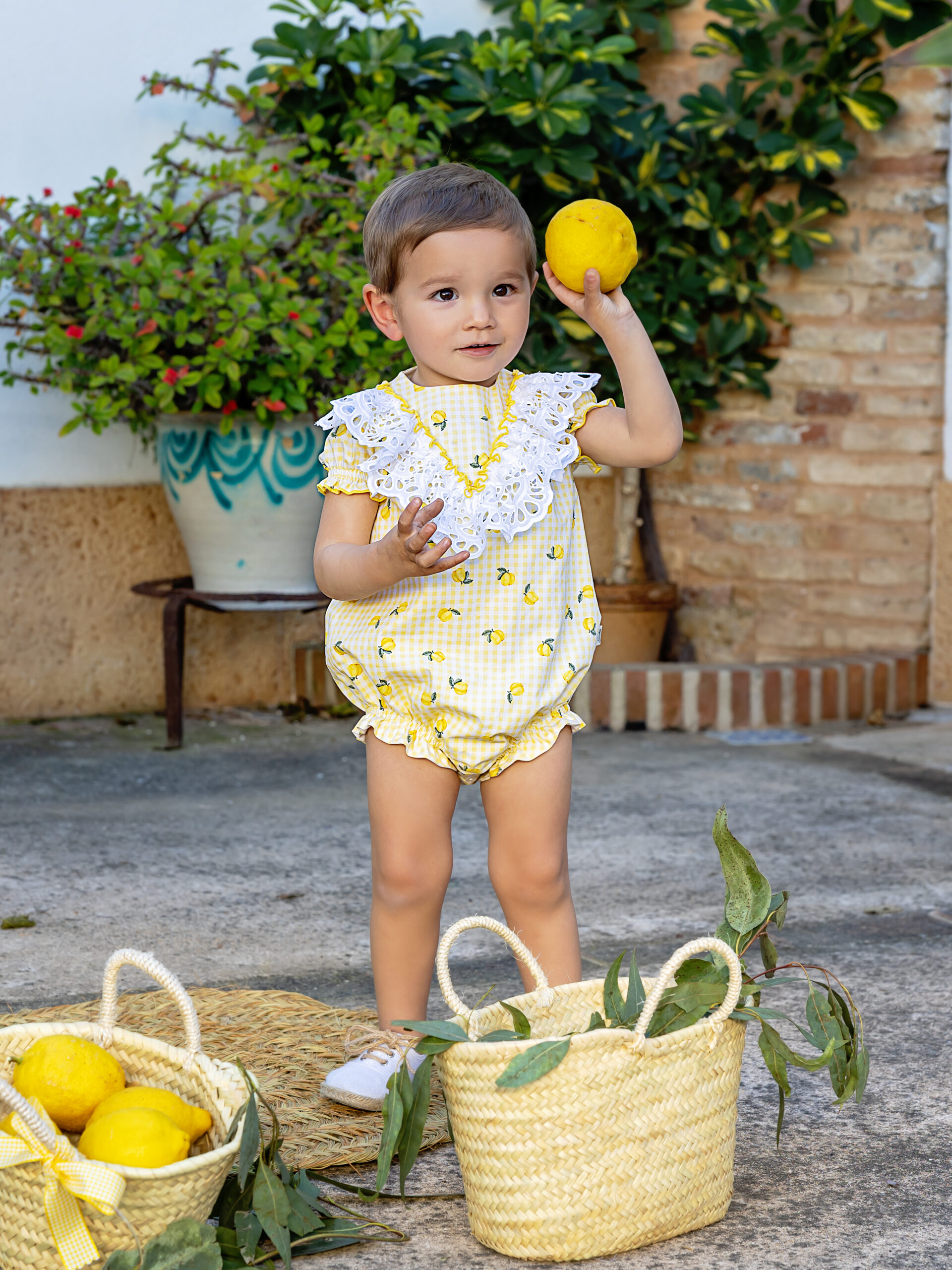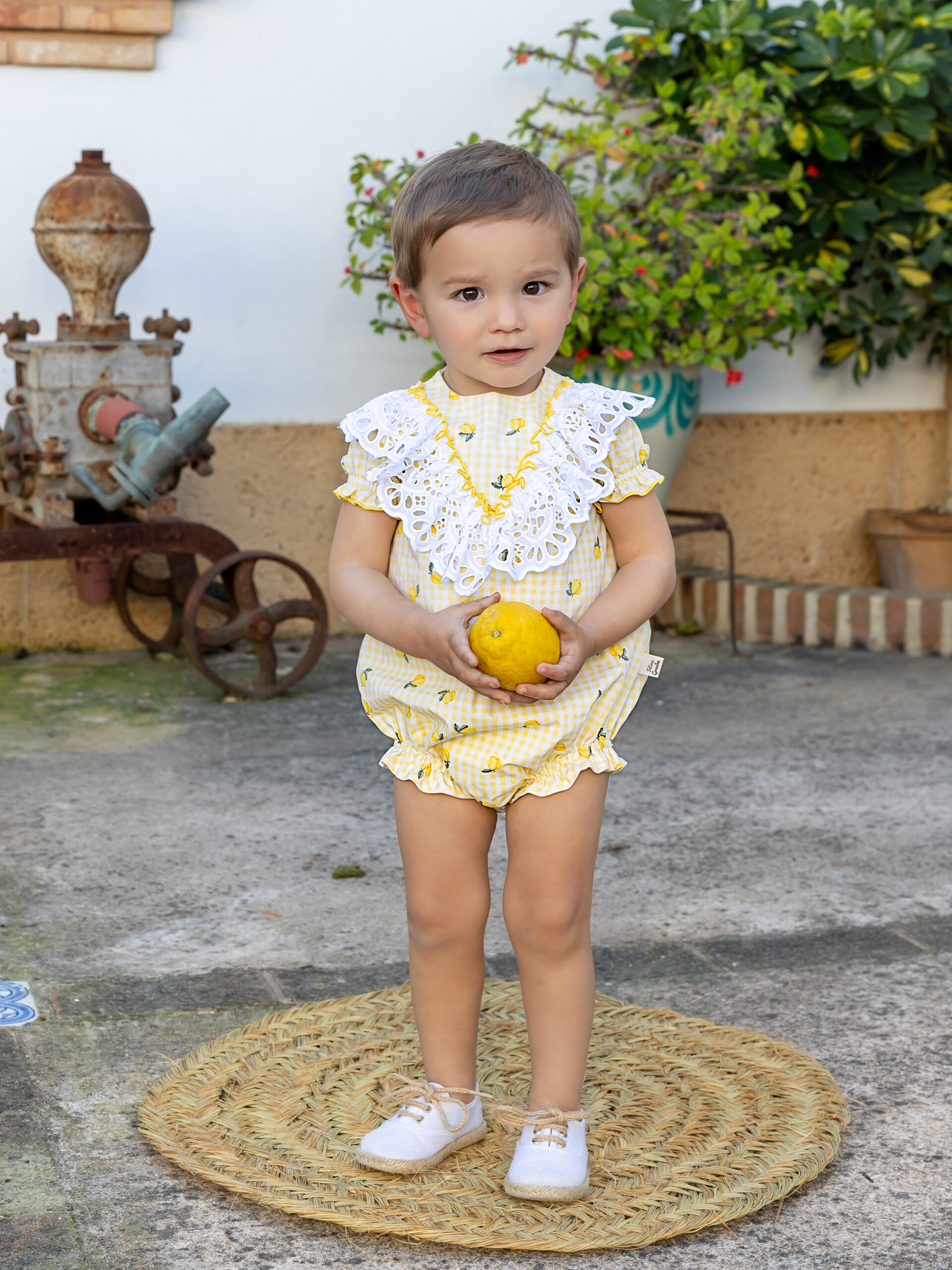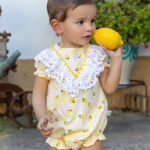 La Pelele límenselo es una prenda encantadora y muy veraniega, ideal para los más pequeños. Está confeccionada en un tejido ligero de cuadros en blanco y amarillo, decorado con un alegre estampado de pequeños limones que aporta frescura y un estilo muy mediterráneo.